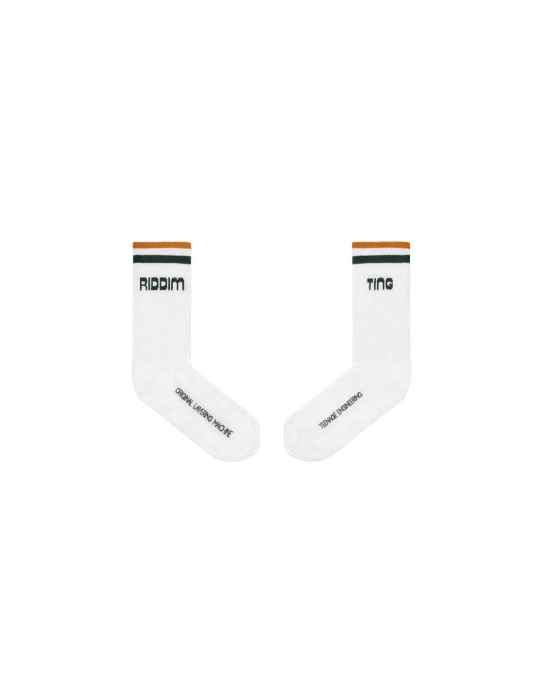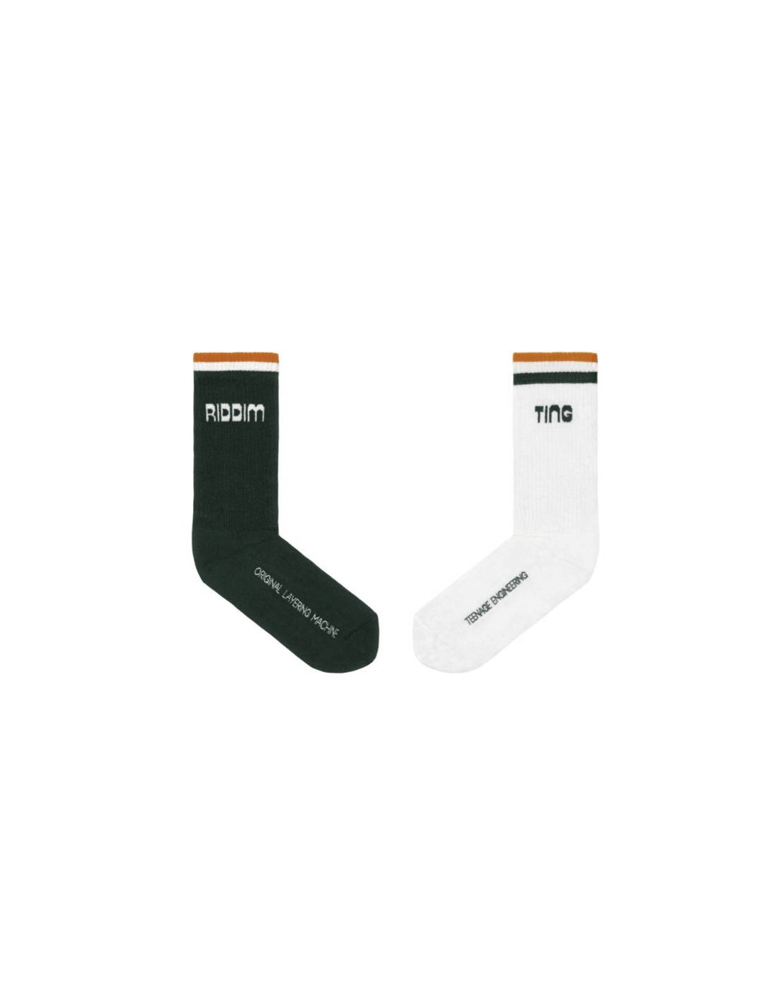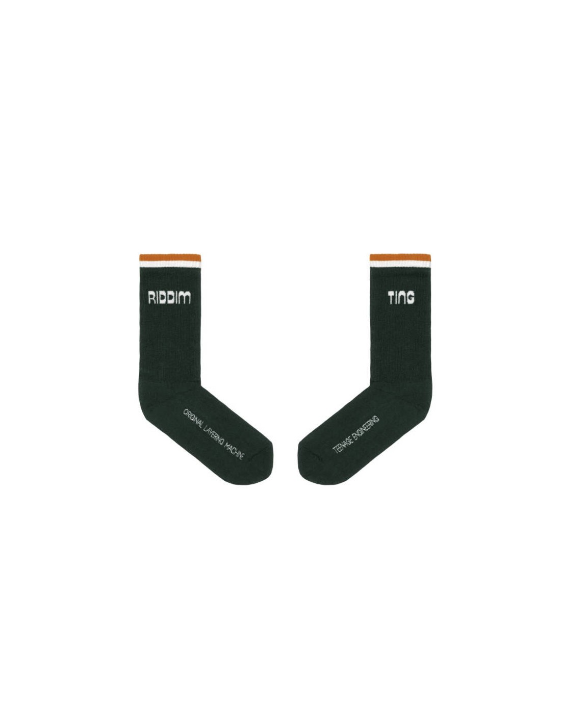 Teenage Engineering EP–40 Cotton Socks L es un pack de 2 pares de calcetines de algodón, uno verde y uno blanco, con suela acolchada y ajuste a media pantorrilla. Presentan el logo “Riddim n’ Ting” en jacquard en la parte externa de la pantorrilla y un estampado original “layering machine” en la suela. Diseñados para combinar comodidad, estilo y la identidad visual del universo EP–40.